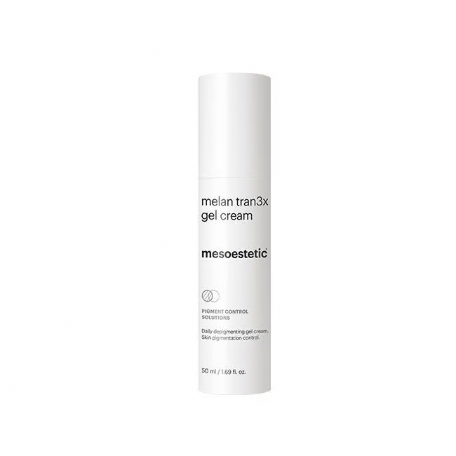 Melan Tran3x gel cream Mesoestetic PIGMENT CONTROL SOLUTIONS es un gel-crema despigmentante de uso diario . Diseñado para actuar gradualmente sobre las manchas en la cara, este producto ofrece una solución eficaz para lograr un tono de piel más homogéneo.